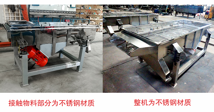 直線振動(dòng)篩有兩種選擇方式:①接觸物料部分為不銹鋼材質(zhì),其他部分為碳鋼材質(zhì),②整機(jī)為不銹鋼材質(zhì),具體選擇哪種不銹鋼直線振動(dòng)篩,還需要根據(jù)物料性質(zhì)以及用戶的實(shí)際需求選用不同的材質(zhì),如果您的適用場(chǎng)景對(duì)衛(wèi)生要求高的話可以采用第二種方案。