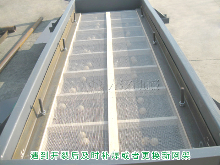 直線振動(dòng)篩的篩網(wǎng)是由網(wǎng)架固定成型,所以應(yīng)該檢查網(wǎng)架是不是有變形或開(kāi)裂,遇到開(kāi)裂后及時(shí)補(bǔ)焊或者更換新網(wǎng)架。