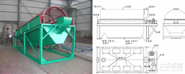 電機(jī)驅(qū)動滾筒軸線作旋轉(zhuǎn)運(yùn)動,減速機(jī)調(diào)節(jié)筒體以一定的轉(zhuǎn)速旋轉(zhuǎn),物料由進(jìn)料口進(jìn)入筒體內(nèi),在旋轉(zhuǎn)產(chǎn)生的離心力作用下,物料在筒內(nèi)翻滾,自上而下通過分級篩網(wǎng)析出,由于篩網(wǎng)分級尺寸不同,物料逐漸被分離篩選,粒度合格的物料經(jīng)篩分后落入到各自的漏斗,然后由人力方式運(yùn)出或通過輸送機(jī)自流送往成品站。合格產(chǎn)品經(jīng)過下端出料口排出,顆粒較大,分選不合格的產(chǎn)品經(jīng)另一排料口排出,筒內(nèi)清理裝置,使篩網(wǎng)不宜被阻塞。