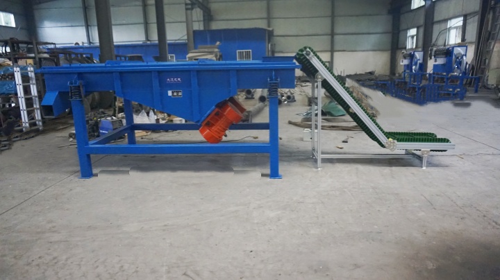破碎機(jī) + 振動篩:廢舊輪胎經(jīng)破碎機(jī)撕裂、破碎成橡膠塊后,由輸送帶送入振動篩,通過粗篩網(wǎng)分離出未破碎完全的大塊橡膠與雜質(zhì),合格橡膠塊進(jìn)入下一道工序。