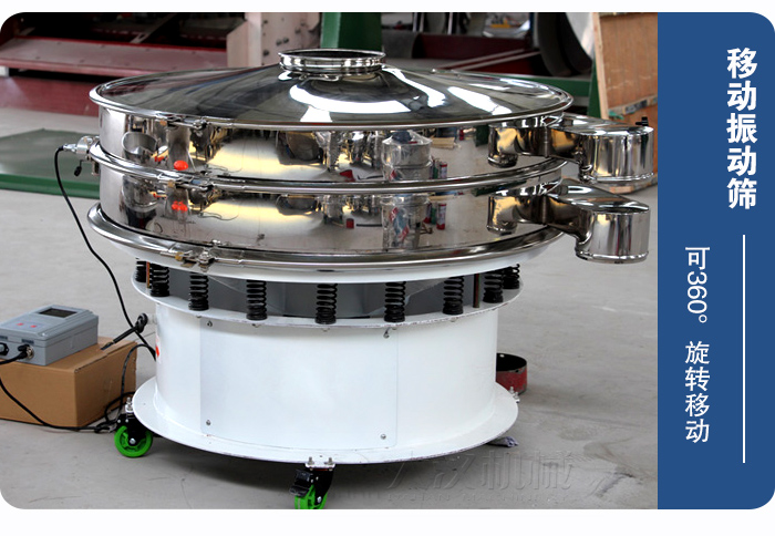 該設(shè)備底部加裝萬向旋轉(zhuǎn)輪,可360°旋轉(zhuǎn)移動,所以稱之為:移動振動篩