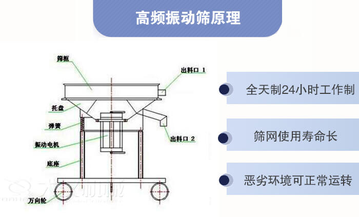 高頻振動(dòng)篩又稱高頻過濾篩,結(jié)構(gòu)簡單、體積小、具有高頻率,低耗能的特點(diǎn),頻率每分鐘可達(dá)3000次,比相同機(jī)型的篩分過濾設(shè)備耗能減少一半,與物料接觸部分皆可采用不銹鋼304或者316L材質(zhì)。