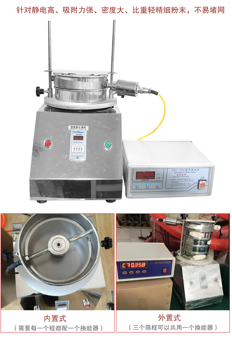 在標(biāo)準(zhǔn)檢驗(yàn)篩基礎(chǔ)上增加了超聲波篩分系統(tǒng),解決了篩分200目以上高目數(shù)產(chǎn)品或普通檢驗(yàn)篩難以篩分的易結(jié)塊、易帶靜電的產(chǎn)品的難題,并防止篩網(wǎng)堵塞。