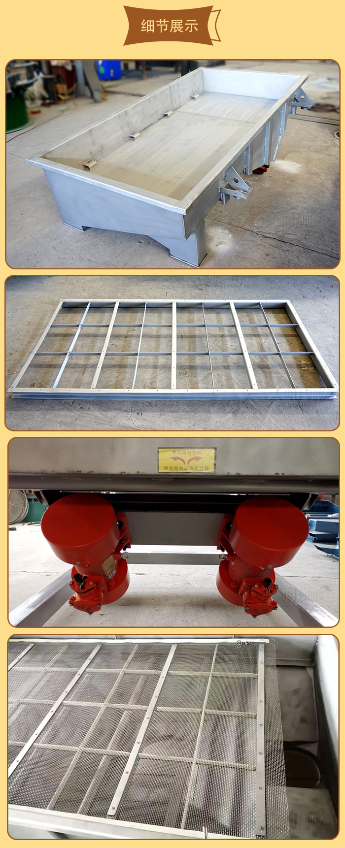 1、篩箱:由數(shù)種厚度不同的鋼板焊制而成,具有一定的強度和剛度,是篩機的主要組成部分。