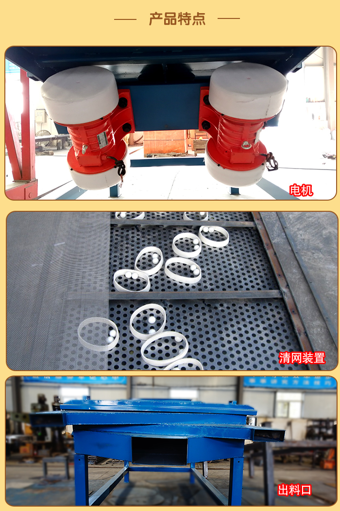 6、設(shè)備在停機(jī)時產(chǎn)生瞬間的共振區(qū),此時振幅和噪聲會明顯增大,屬正常現(xiàn)象,設(shè)備在開停機(jī)前,篩面上不得有存留物料,篩網(wǎng)需經(jīng)常檢查是否張緊、破損,如有破損要即時更換。