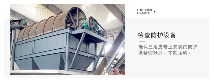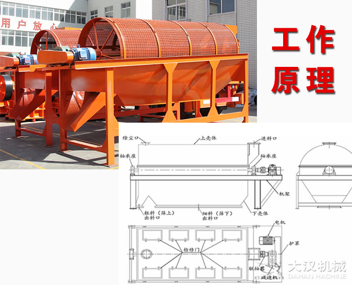 滾筒篩篩沙機(jī)主要由電機(jī)、減速機(jī)、滾筒裝置、機(jī)架、密封蓋、進(jìn)料口、出料口等部分組成。滾筒裝置傾斜安裝于機(jī)架上。電動(dòng)機(jī)經(jīng)減速機(jī)與滾筒裝置通過(guò)聯(lián)軸器連接在一起,驅(qū)動(dòng)滾筒裝置繞其軸線轉(zhuǎn)動(dòng)。當(dāng)物料進(jìn)入滾筒裝置后,由于滾筒裝置的傾斜與轉(zhuǎn)動(dòng),使篩面上的物料翻轉(zhuǎn)與滾動(dòng),使合格物料(篩下產(chǎn)品)經(jīng)滾筒后端底部的出料口排出,不合格的物料(篩上產(chǎn)品)經(jīng)滾筒尾部的排料口排出。由于物料在滾筒內(nèi)的翻轉(zhuǎn)、滾動(dòng),使卡在篩孔中的物料可被彈出,防止篩孔堵塞。