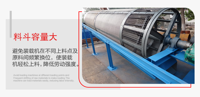 4.儲(chǔ)料斗容量大,使裝載機(jī)合理安排主設(shè)備(如攪拌站)與篩砂機(jī)的上料時(shí)間,避免裝載機(jī)在不同上料點(diǎn) 及原料間頻繁換位,使裝載機(jī)輕松上料,降低勞動(dòng)強(qiáng)度。