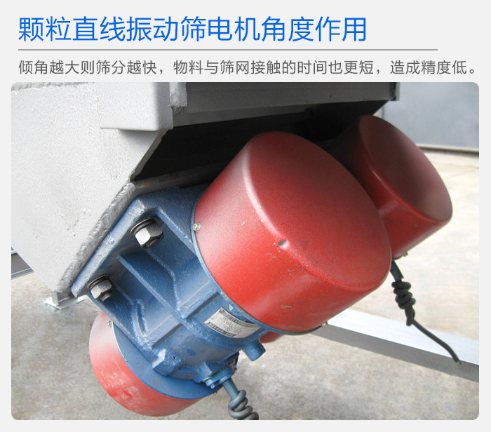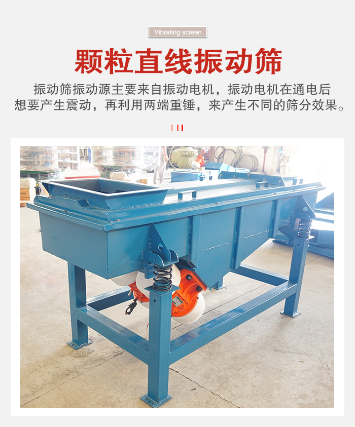 顆粒振動篩根據(jù)篩分原理主要分圓形和方形兩種結(jié)構(gòu),振動篩振動源主要來自振動電機,振動電機在通電后想要產(chǎn)生震動,再利用兩端重錘,來產(chǎn)生不同的篩分效果。