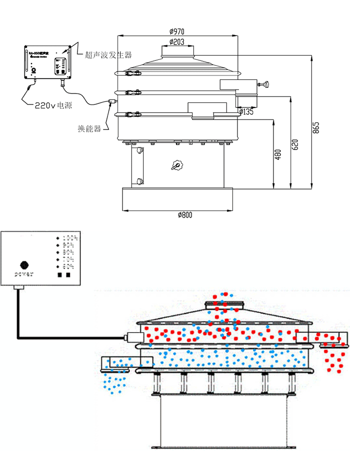 超聲波振動篩結(jié)構(gòu)和旋振篩機構(gòu)相同,只不過是在旋振篩的基礎(chǔ)上加裝了超聲波振動裝置。超聲波振動裝置可以使超聲波振動篩的篩分效率高出很多。
